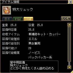 このリュックとはずいぶん色々なところへ行きました。大陸ダンジョンで5Fに到着した瞬間にふんどしマンに襲われ、最初の耐久が減りましたw